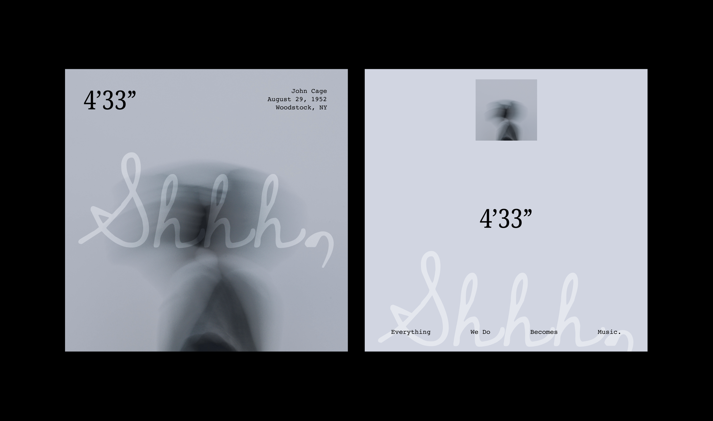 4'33" is an experimental piano composition that abandons traditional notation, inviting performers to embrace the ambient sounds of the environment. During its performance, only subtle background noises fill the space, transforming silence into an active element of the piece. This groundbreaking work challenged established definitions of music, establishing itself as one of the most influential and controversial compositions in the genre. Inspired by John Cage’s revolutionary spirit, I have interpreted this concept in an album cover design that features his quote, "Everything we do becomes music," rendered in a minimalist, understated style.